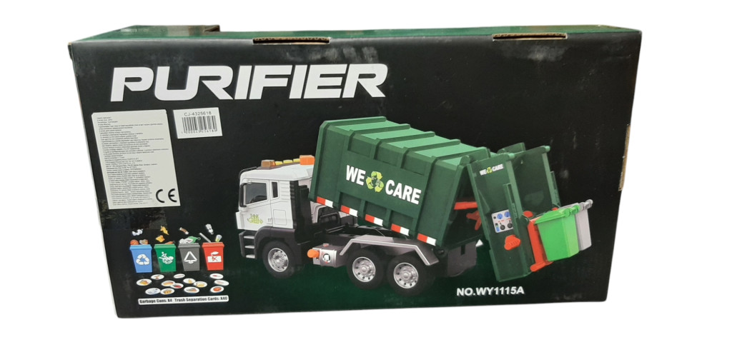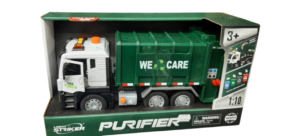 Ez a látványos zöld-fehér kukásautó nemcsak méreteivel, hanem élethű funkcióival is kiemelkedik. A jármű különlegessége a levegős pumpás emelőrendszer, amivel a tartály ürítése gombnyomásra vezérelhető. A fülke tetején található gombok segítségével különböző fény- és hangeffektusok aktiválhatók, amelyek még izgalmasabbá teszik a munkát. A szetthez tartoznak kisméretű szelektív hulladékgyűjtő kukák és kártyák is, így a gyerekek játékos formában tanulhatják meg a hulladékválogatás fontosságát. Az ajtók nyithatóak, a lendkerekes meghajtás pedig gondoskodik a sima gurulásról.